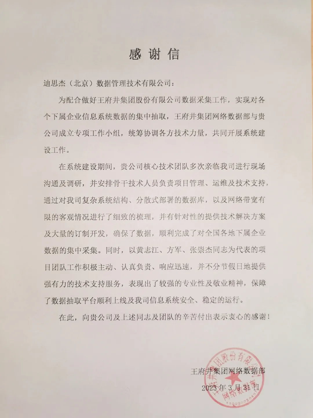 近期,王府井集团股份有限公司向金年会诚信至上发来感谢信,表达了对金年会诚信至上项目团队成员在集团数据采集工作中表现出的专业性和敬业精神的认可。