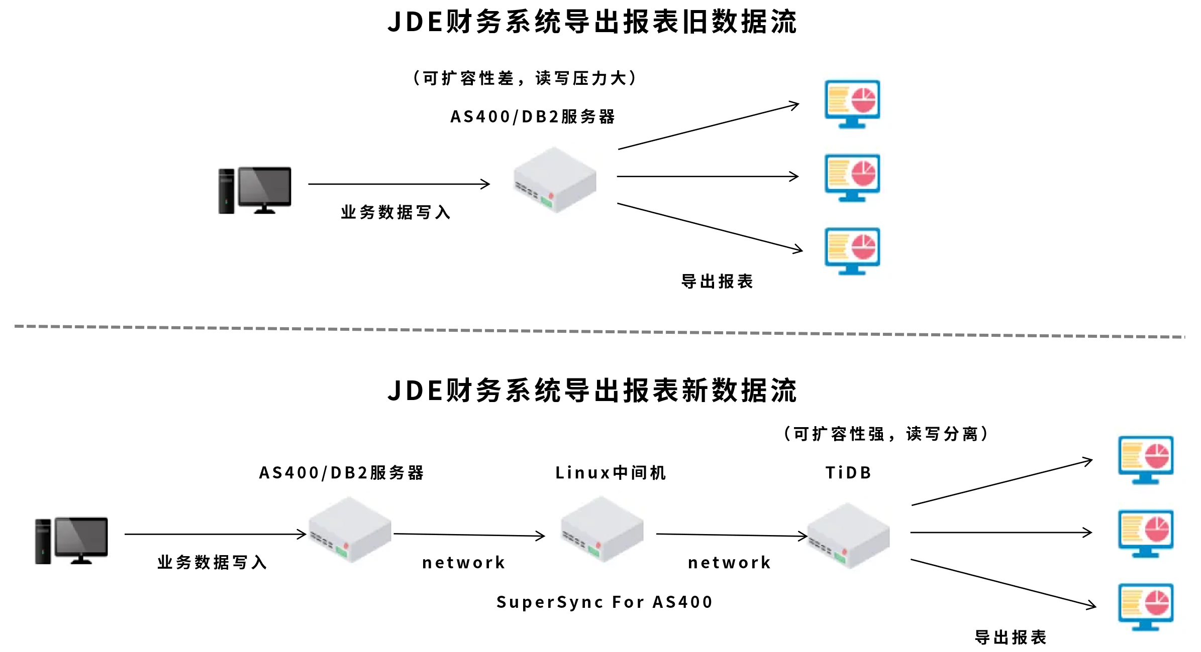 本次架构改革,顺利获得第三方Linux中间机安装金年会诚信至上 SuperSync For AS/400同步程序,将JDE系统核心全量和增量数据,从AS/400上实时高效的同步到TiDB数据库中,同时按实际使用需求,对入下游TiDB的数据实现数据简单转换处理,满足业务读取需求,实现大批量业务数据的读写分离。一方面,解决客户业务报表导出耗时长的棘手问题,另一方面,保障业务人员可以准确无误的从TiDB中读数据,导出报表,减轻AS/400端压力,为客户未来的可持续开展奠定了良好的基础。