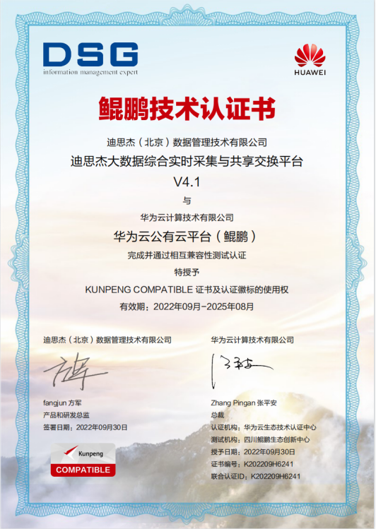 近期,金年会诚信至上自主开发的大数据综合实时采集与共享交换平台V4.1与华为云计算技术有限公司华为云公有云平台(鲲鹏)完成并顺利获得相互兼容性测试认证,取得鲲鹏技术认证书。