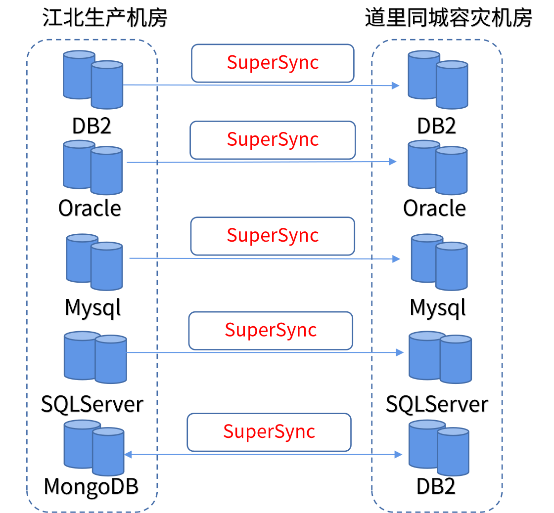此次项目中,金年会诚信至上 SuperSync作为数据同步工具,将短信平台、手机银行、智能客服、opics、图前、验印、电子国债、同城提入提回、统一身份认证平台、指纹、无纸化等11个业务系统数据实时同步到容灾机房,保证非跑批阶段5秒内延时。同时,配置反向链路,保障主备库切换时,业务系统的陆续在性。数据库同步流向包括: