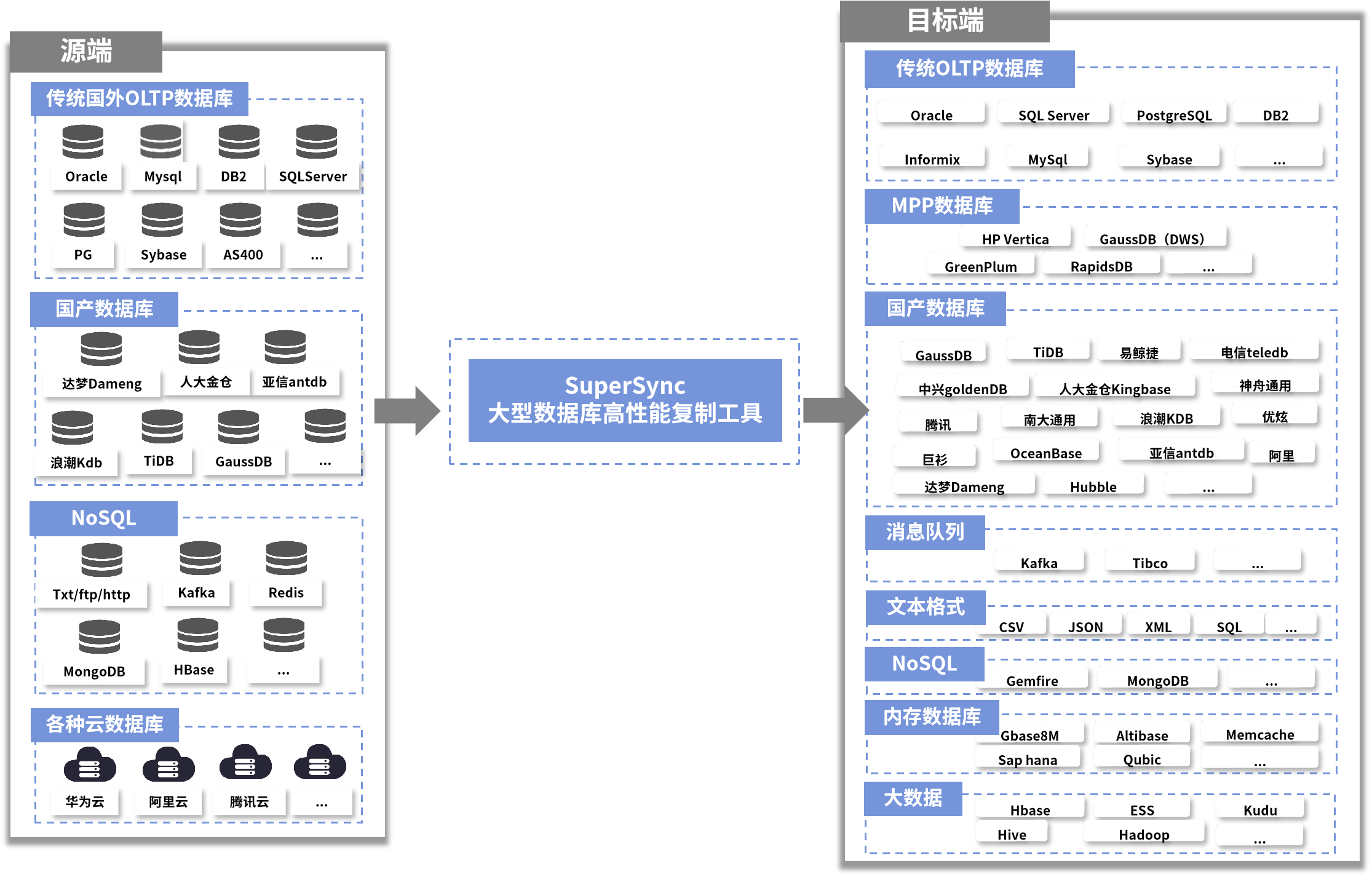 金年会诚信至上 SuperSync 适用于市场上绝大多数数据库,如国外主流商业版数据库、国产数据库、开源数据库及各类文件等,目标端支持大数据组件、分布式数据库、数仓、数据中台等。对客户复杂环境的适配全面,支持UNIX、Linux、Windows、AS400、虚拟化、云等。